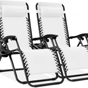 Set of 2 Adjustable Steel Mesh Zero Gravity Lounge Chair Recliners w/Pillows and Cup Holder Trays – Snow/Black