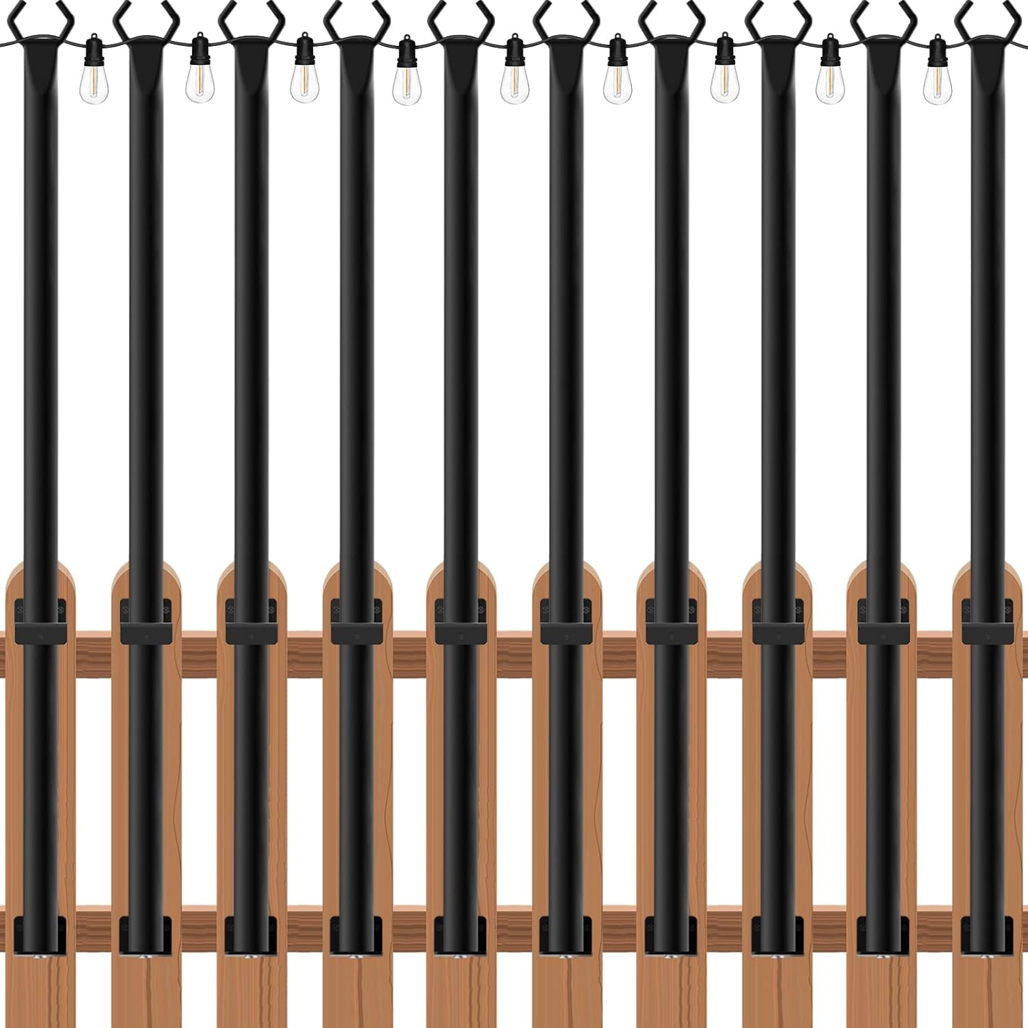 - No height restrictions:Made of high quality metal, it will not bend or wobble. The poles for string lights is not limited by its own length, and the excellent load-bearing properties allow you to install it on high fences and walls. Get rid of the general height limitation. You can also hang more number of strings of lights. Also can be applied to banners, lanterns, wind chimes, all kinds of light decoration, etc.