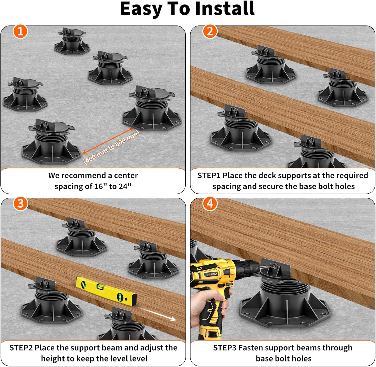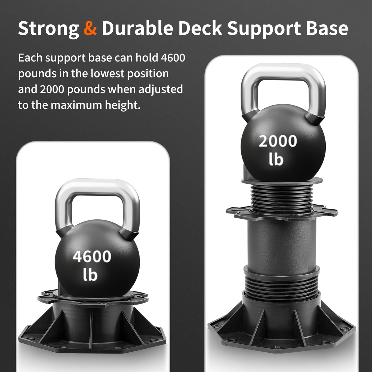 - 【New Upgrade】Compared to traditional concrete-based wood or iron deck support pedestals, our deck support pedestals are made of polypropylene composite for strength, weigh only 1.76 lbs., and are resistant to UV light, weather, seawater, and most chemicals. Withstands temperatures ranging from -22 °F to +230°F (-30°C to +110°C)
