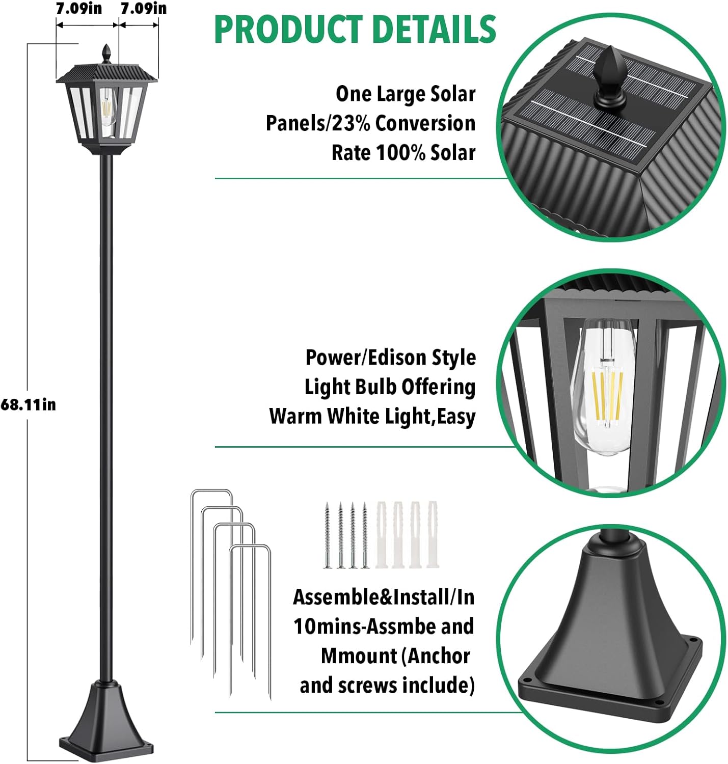 - Durable and Reliable: solar garden light’s pole is made of stainless steel with a black rust-resistant coating to withstand high temperatures and corrosion. Its IP45 waterproof design makes the outdoor solar pathway light better able to cope with various weather conditions. outdoor solar post light head uses high-molecular acrylic material, which has excellent light transmittance, is more durable, and does not easily discolor. The E26-type bulb extends the service life of the equipment and uses four tungsten filaments to achieve 360° uniform light emission, providing a wider illumination range