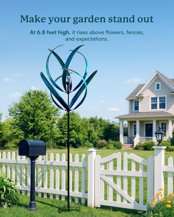 - BEAUTIFUL LOTUS DESIGN: This towering Double-Tier metal wind spinners features a lovely blue finish and lotus design. Dual rotors spin independently and rotate 360 degrees. The kinetic yard wind spinners has thickened poles (diameter 22 mm) and stable metal stake with 3 prongs to ensure its firmly planted for windy days and against a snowy landscape