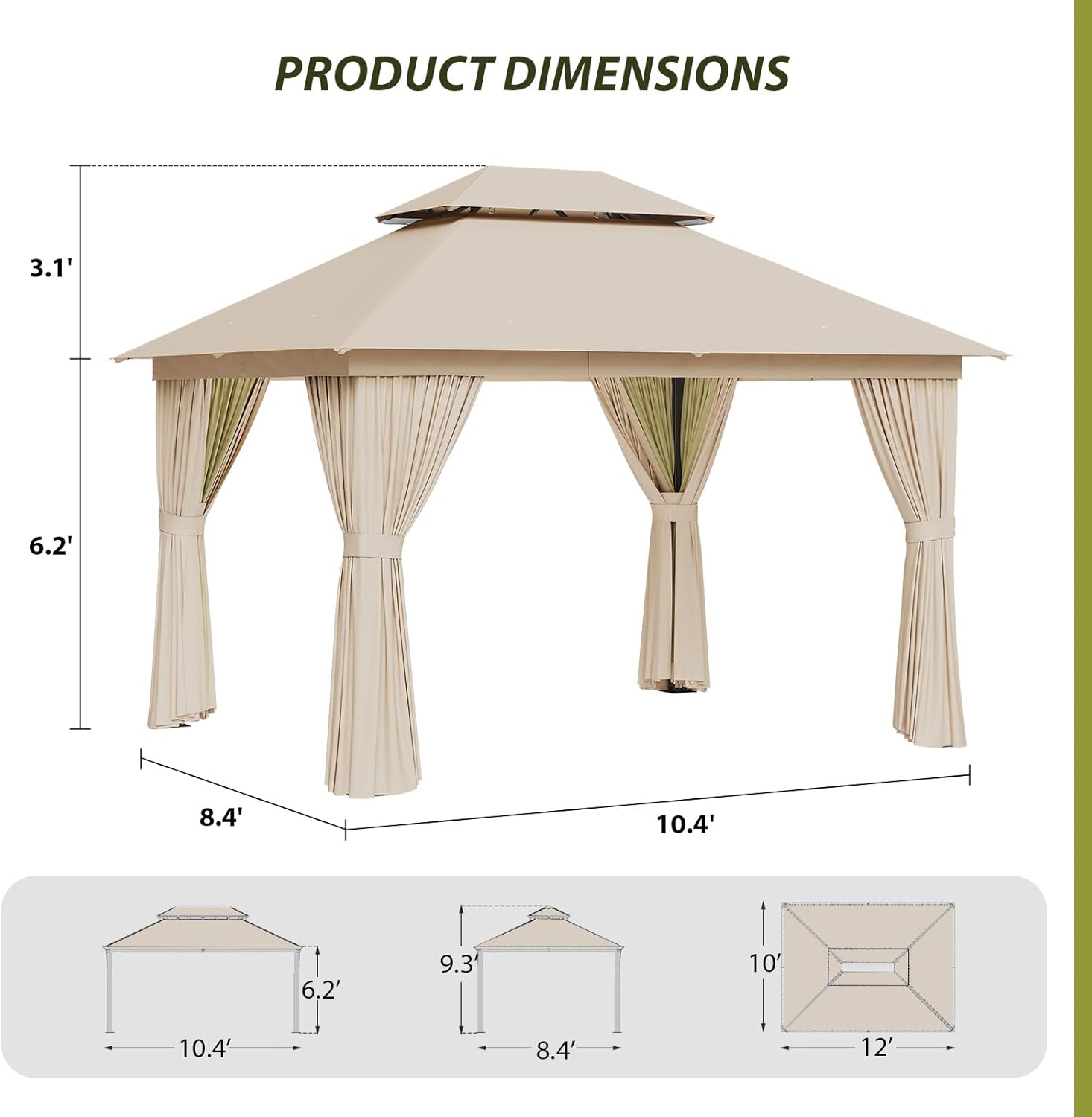 • 【Ventilated Double Roof】Peaked vented roof design enhances airflow while blocking 99.99% UV rays (UPF 50+). Mosquito-proof mesh netting and waterproof curtains offer all-season protection, keeping spaces cool in summer and private in winter. Perfect for family gatherings, garden parties, or outdoor relaxation
