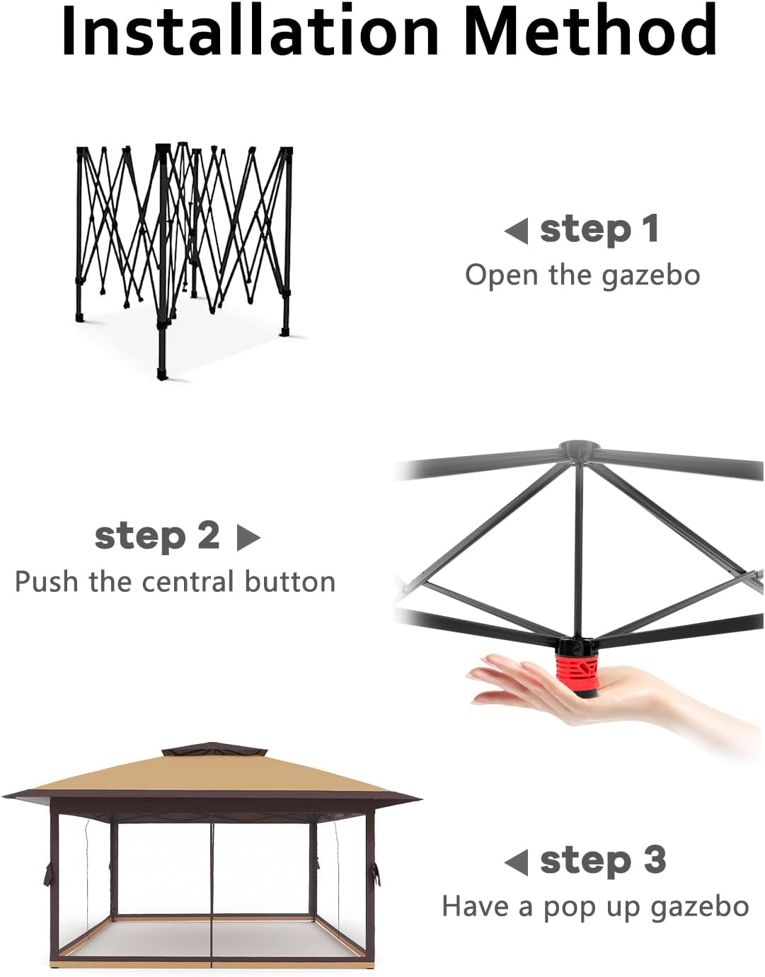 - 【Easy Set Up Gazebo】- This pop up gazebo features the patented【One Step Center Lock】technology, allowing effortless setup without tools. Simply push the button, and the outdoor gazebo assembles in minutes. Whether camping, having a picnic, or relaxing in your backyard / Patio, this gazebo ensures instant enjoyment.