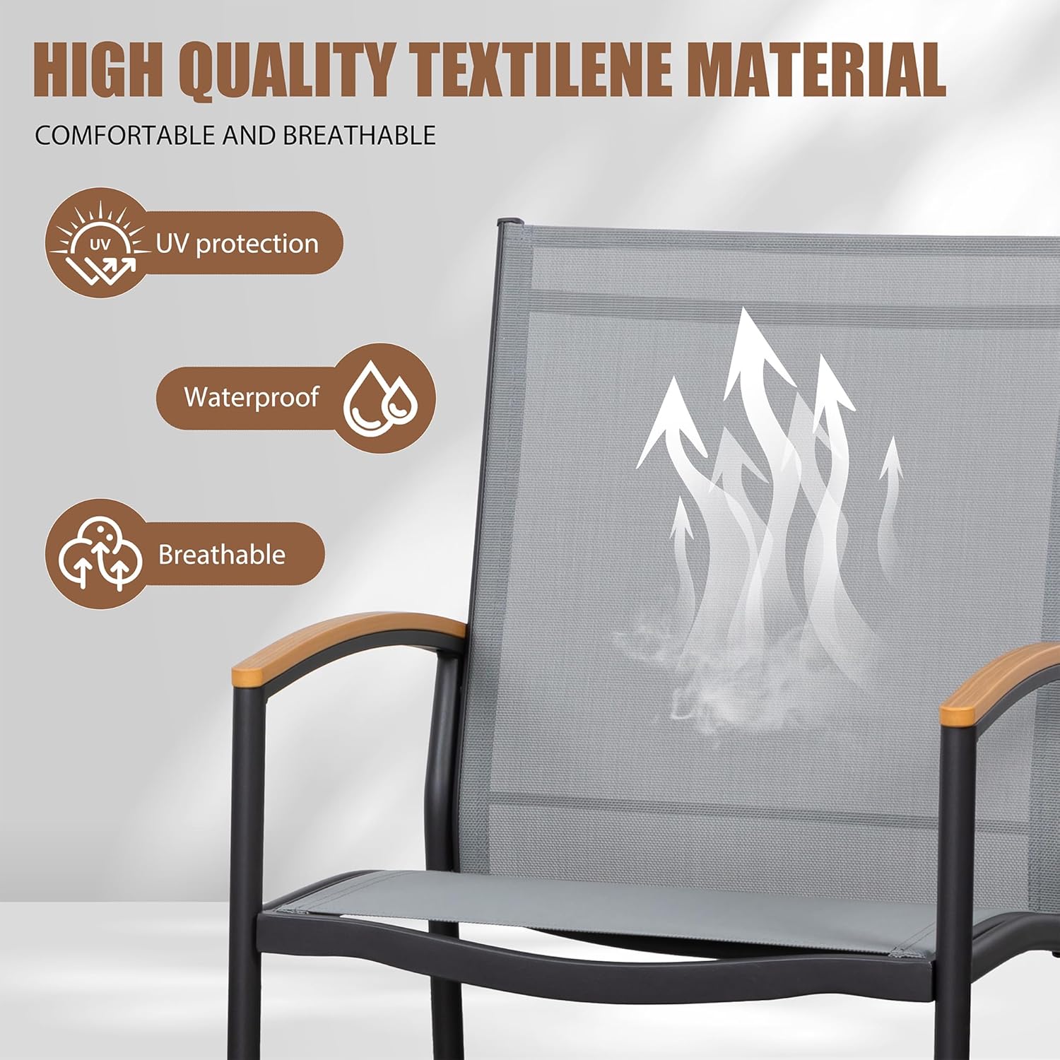 - Upgraded Breathable Fabric: Textilene fabric for the chair which is breathable and cool, you will not feel hot even in Summer, and is much more comfortable than rattan seats. The material is tear and weather resistance, easy to clean.