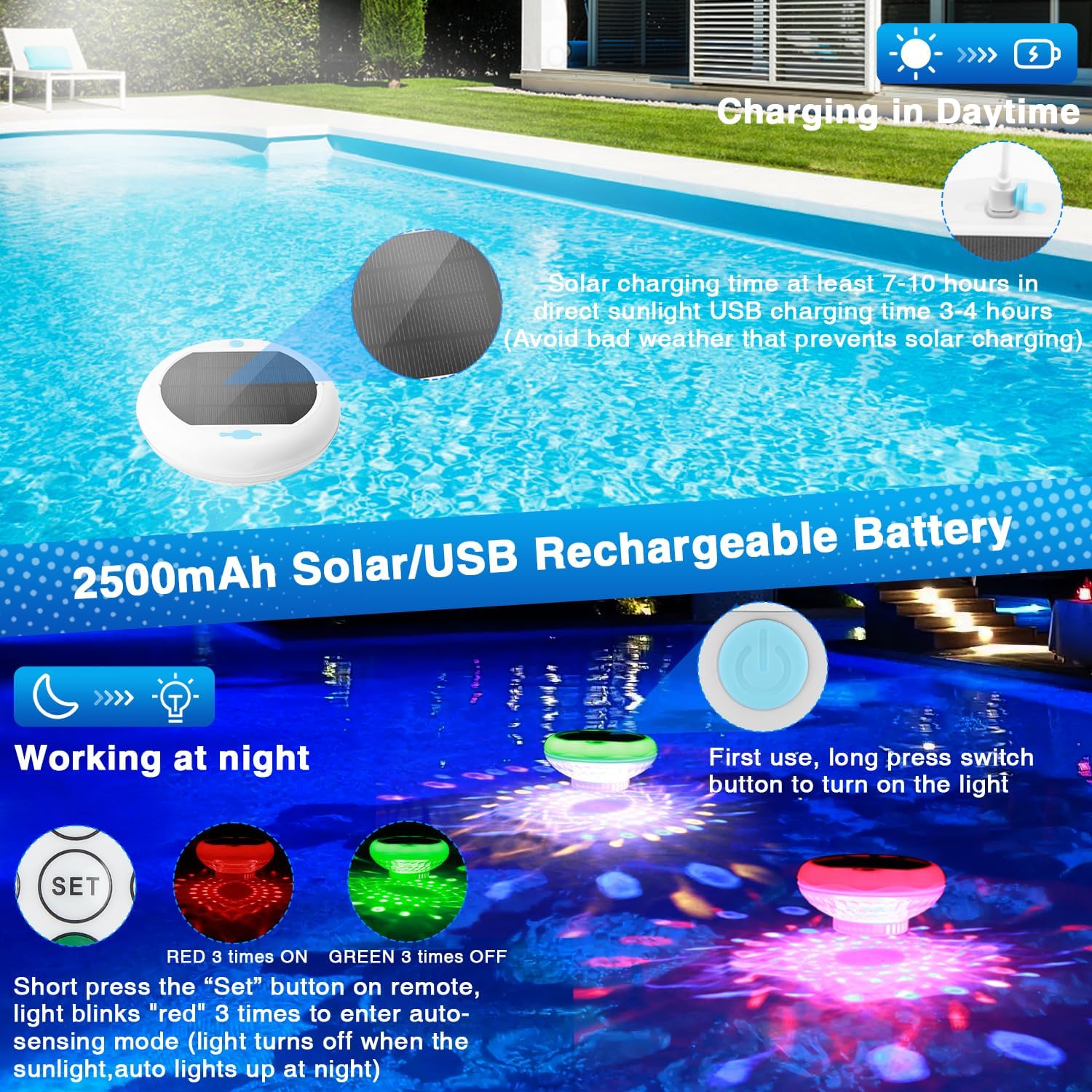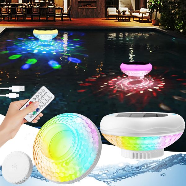 / Solar Pool Chlorine Floater, Solar Pool Lights, USB Charging, Adjustable Pool Chlorine Dispenser, 6.69 Inch IP68 Waterproof 2600mAh 13 Color Modes Upper and Lower Glow Pool Lights 2 Pack