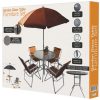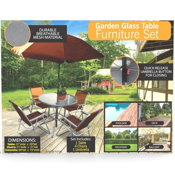 Take this stylish Garden Patio Set with Glass Table and Umbrella and Transform your patio into something everybody will be envious of. With four lightweight folding chairs with durable mesh material that keeps them in great condition for spring and summer months, and one folding umbrella. This (6) piece Outdoors set comes with non-slip feet and the umbrella has securing loops, and quick release button for easy closing. Measurements: umbrella 68″ tall x 72″ wide, table 31″ x 29″, and each chair is 31″ x 20″. Assembly is required.