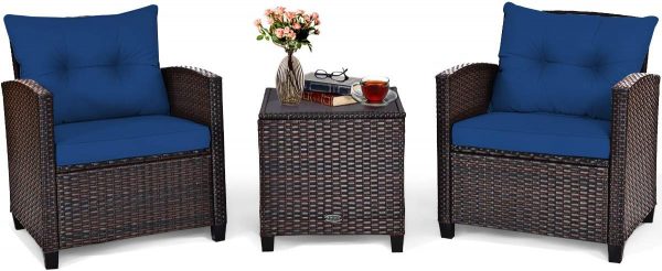 Tangkula 3 Pieces Patio Furniture Set, PE Rattan Wicker 3 Pcs Outdoor Sofa Set w/Tempered Glass Tabletop, (Blue)