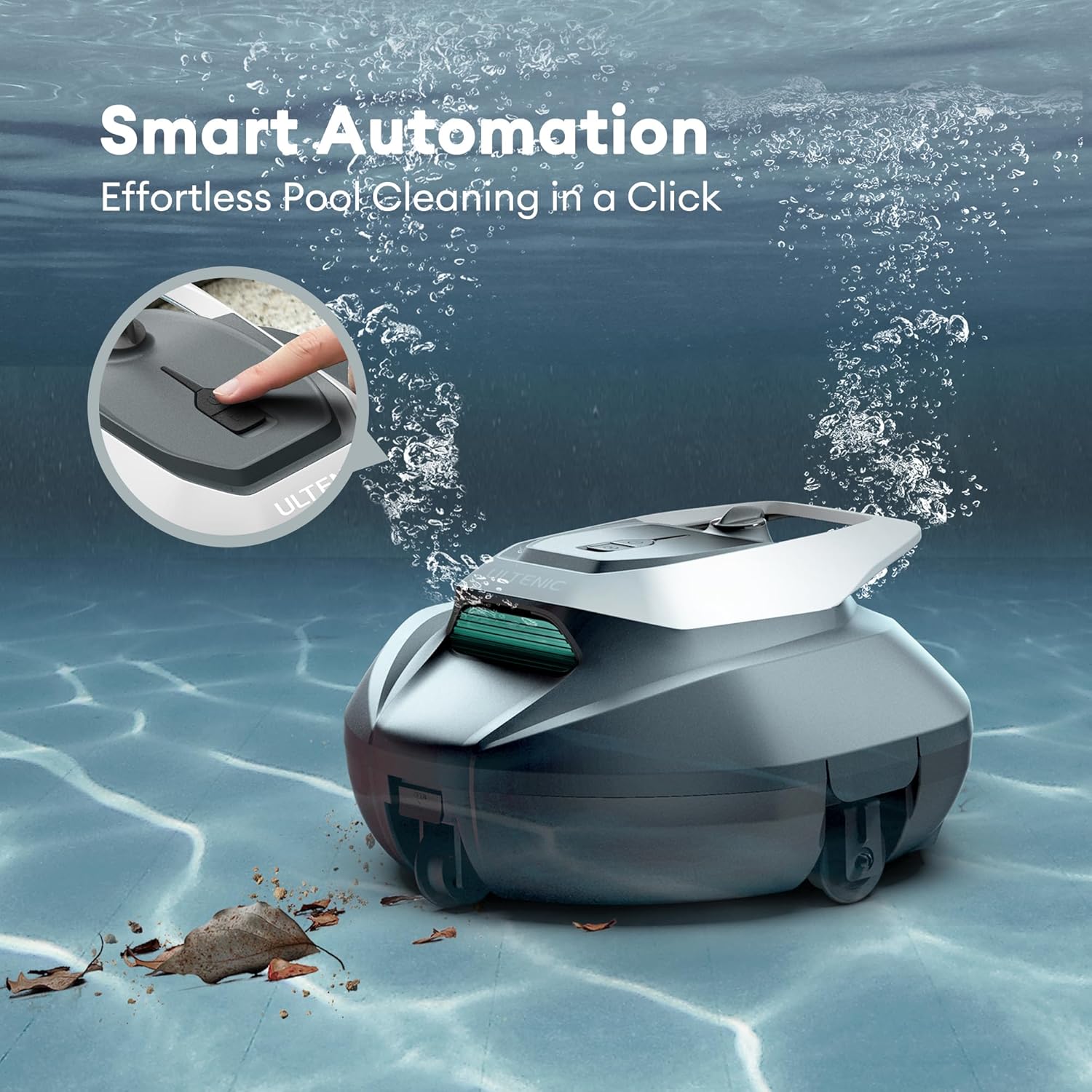 - 【Smart Automation with One Click 】Cleaning your pool has never been easier with this pool cleaner robot! Simply click the knob to start the Ultenic robotic pool cleaner. Its dual large suction ports and bottom brush automatically capture leaves, dirt, and sand—no manual scrubbing needed. Perfect for above ground pool vacuum and inground pools!