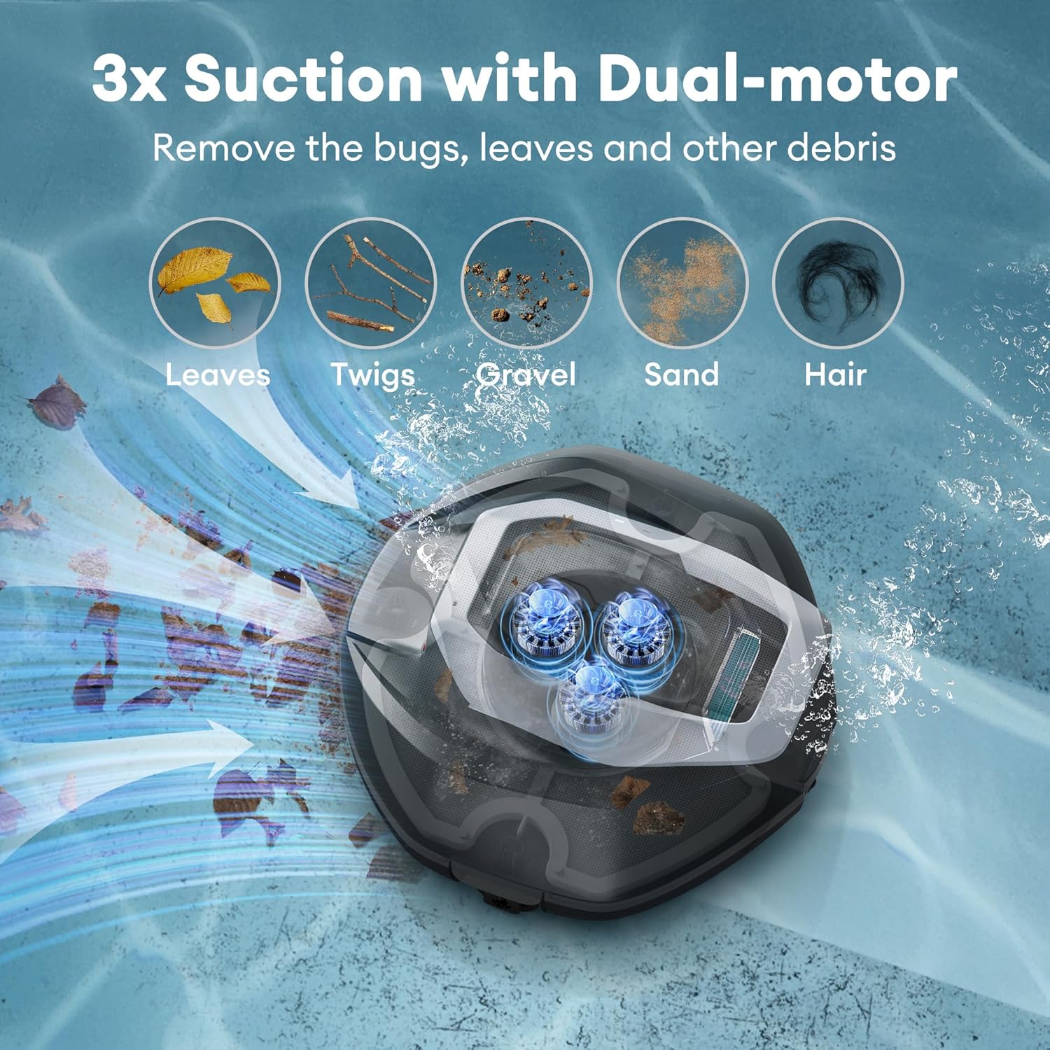 - 【3X HyperPower Motors – Cleans Deeper】This robotic pool cleaner’s triple motors deliver 30GPM turbo suction, annihilating leaves, dirt, and even tiny bugs. Deep-cleans in one cycle, leaving your pool vacuum for inground pools or above-ground pool sparkling.