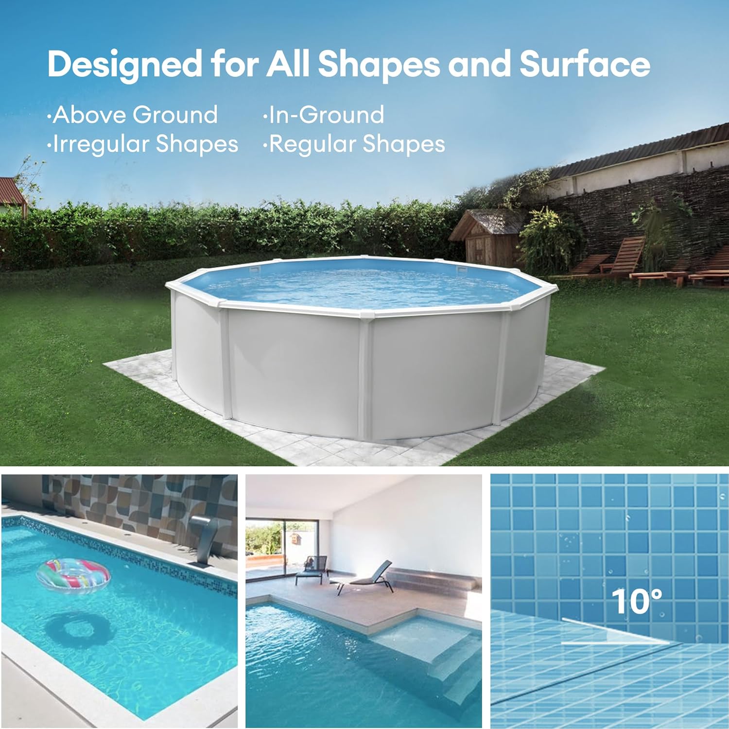 - 【Versatile Pool Compatibility】Designed for both above-ground and inground pools and adapt to various pool shapes, including round, square, and irregular. It can effortlessly clean tile, vinyl, and concrete pools, making it a perfect choice no matter what material your pool is made of.